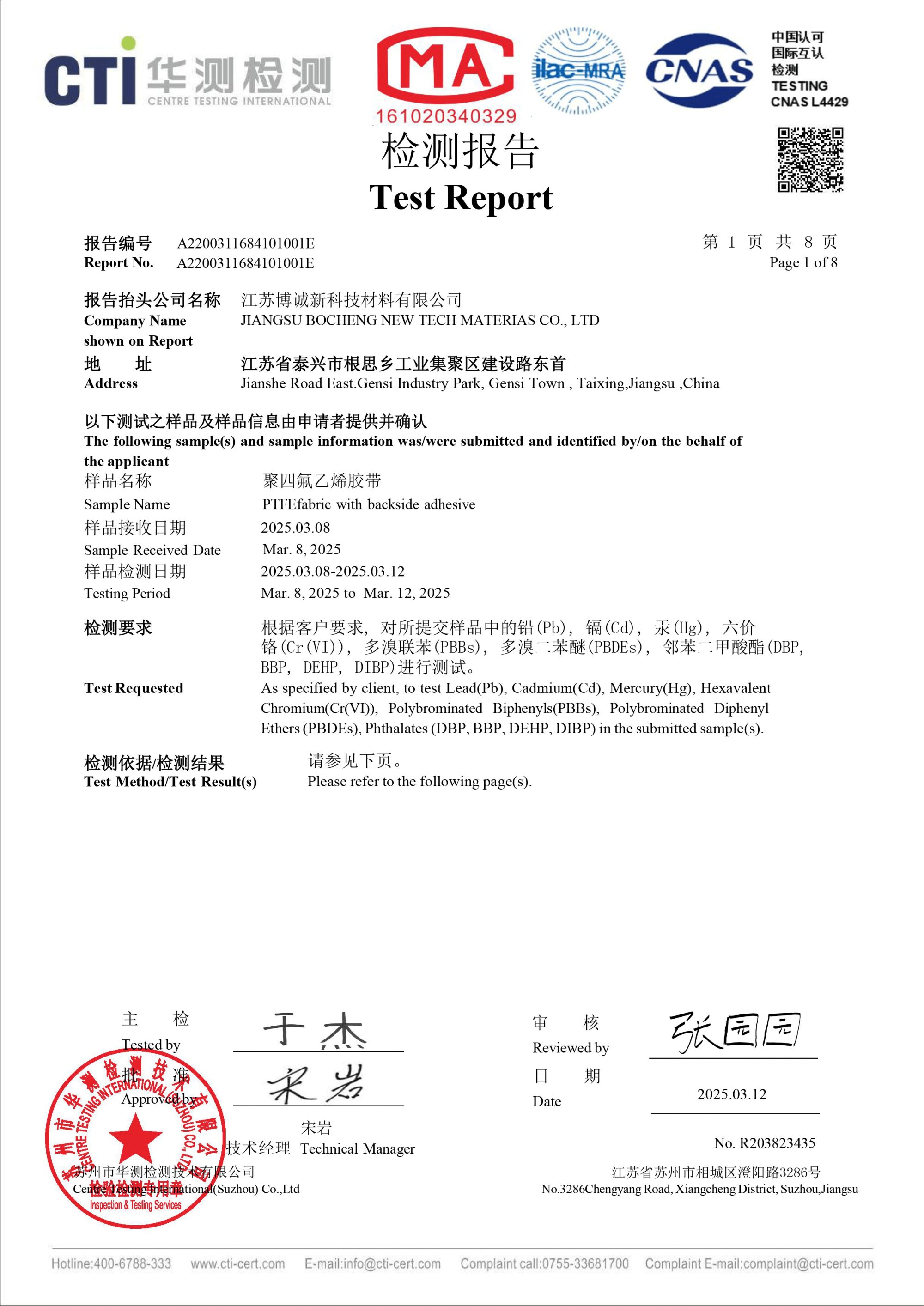 A Jiangsu Bocheng New Materials está equipada com maquinário profissional para a produção de materiais compostos de PTFE Teflon e silicone, com alto grau de automação e controle rigoroso de precisão. Cobrimos todo o processo de revestimento, moldagem e corte, garantindo a produção estável de produtos de alta qualidade, resistentes a altas temperaturas e corrosão.